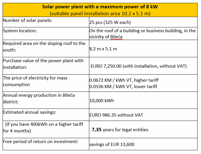 The municipality of Bileća is located in the southeastern part of the Republic of Srpska and Bosnia and Herzegovina. Thanks to the large number of sunny days, it represents a great potential for the construction of solar power plants. Bileća has about 2,200 hours of sunshine, enabling the efficiency of investing in solar energy. Relatively large area and low population allow the construction of plants with solar panels on large areas (with certain interventions in site preparation), and a special option is the installation of solar panels on the surface of Lake Bileća, which would further contribute to reducing water evaporation from the reservoir.